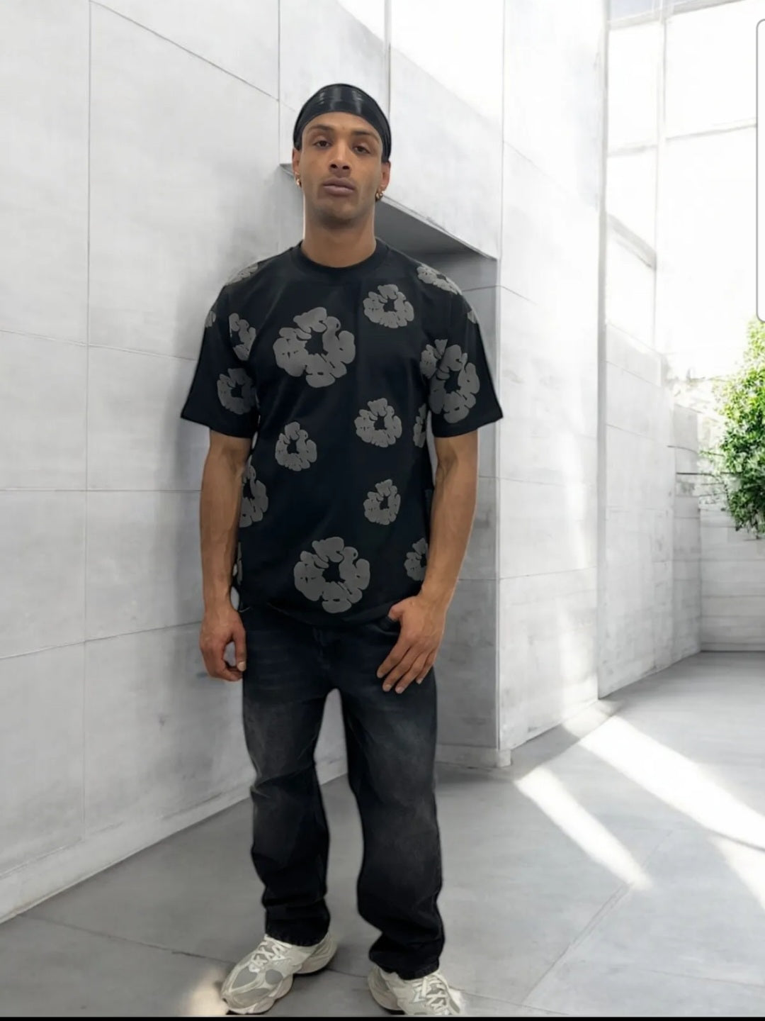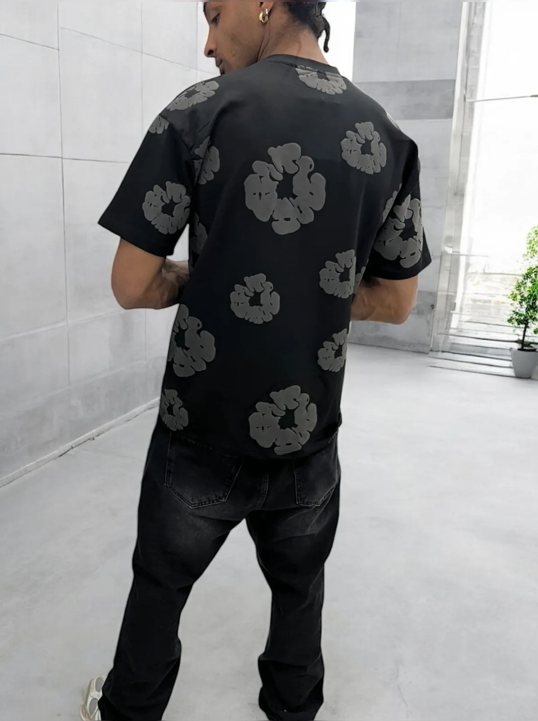 Dit shirt zegt minder, maar laat méér zien. De all-over witte bloemen op een zwarte basis zorgen voor een gebalanceerde look die zowel edgy als clean is.